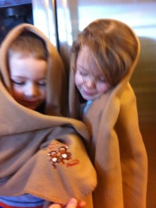 And one more thing: I have a ton of race shirts, so it was kinda nice to get something new in the race swag bag: comfy, embroidered, fleece blankies. My own little twin monkies got a kick out of race mascots!