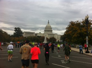 This is my second Marine Corps Marathon and again I was stuck by the complete professionalism and enthusiasm of the hundreds of Marines working to support the event. At every turn, support crews were ready to hand out water, Gatorade, vaseline, food, and encouragement. Everything was done with smiles and trademark Marine humor: at one refueling stop I asked for a cup of water…only to be told by a young Marine that only vodka was available. The signs were also great this year. My personal favorite was at milepost 1: Paul Ryan is already done!
