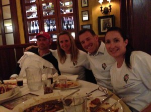 First things first: I ran on the Niall Mellon Township Trust Team. NMTT is Irish-based charitable organization that focuses on building homes for the poor throughout Africa. This was the first year that NMTT pulled a team together for MCM, so only a small (but very committed) crew of runners participated. Here’s a shot of us “carb loading” at Carmine’s in Chinatown on Saturday night.