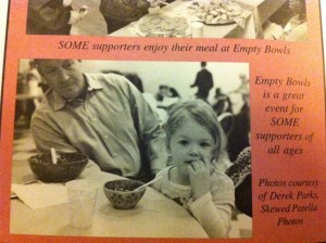 Side note: This is a blog about running, but I have to say: SOME is one of my favorite local charities, and their annual Turkey Trot is just an example of the great community activities/fundraisers they sponsor. Here’s a picture of my dad and younger daughter at the SOME Empty Bowls event. Mark your calendars for 2013!